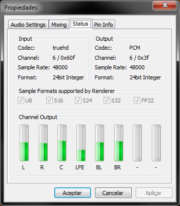 Si desactivo las opciones bitstreaming en la pantalla de los altavoces me pone PCM 2/0 canales aun poniendo audio multicanal, osea estéreo, cuando activo dts o ac3 en bitstreaming, si se escuchan en 5.1 pero está en concreto (DTS-HD) no, sigue igual..