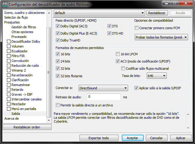 Como reproductor, uso el Media Player Classic - Home Cinema (mpc-hc), y esta es la configuración que tengo puesta en "decodificador de audio"