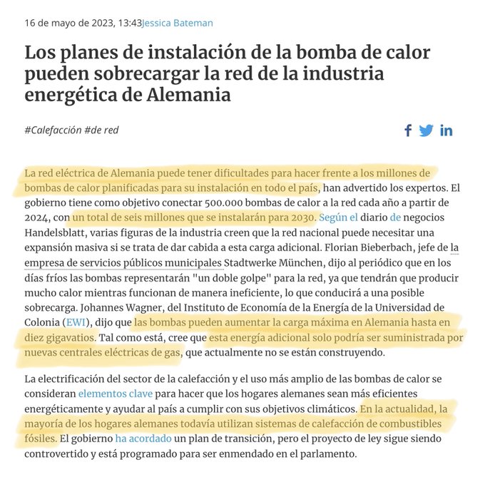 Esta es una de esas razones que me dejan patidifuso con todo esto de las renovables y la energía verde. Aceptando que el CO2 provocado por la siniestra mano humana nos va a llevar a una destrucción segura lo que si es seguro a día de hoy es que las medidas que dicen que nos van a salvar son inútiles. En ese artículo se habla de las bombas de calor pero si lo comparas con lo que supondría el cambio a una movilidad eléctrica es anecdótico, esto supondría como poco duplicar la infraestructura eléctrica de nuestro sistema, una auténtica barbaridad inalcanzable y de un coste inimaginable. Es decir, esto no es física nuclear, cualquier ingeniero puede hacer los números y llegará a las mismas conclusiones. Las renovables tienen unas limitaciones tan claras que nadie la puede tomar en serio como una alternativa viable para la sustitución de las generación convencional, llámense Ciclo Combinado o Nuclear. Parece que hay una confianza en que se desarrollarán nuevas tecnologías de generación solar o eólicas y de baterías que no suceden ni sucederán en un tiempo razonable. Y esto solo por apuntar dos temas que son fundamentales para esta tema, que si nos metemos en los entresijos es inacabable las incongruencias en que se apoyan estas políticas verdes.