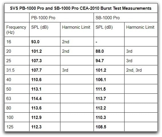 Aquí análisis y las cifras CEA 2010 que son entre 2-3 db más altas que las dadas por el compañero que inicio el hilo,ahora se ve la gran evolución de ambos subs siendo la del pb1000 pro muy destacable por encima de 25hz hasta la zona de patada. https://www.audioholics.com/subwoofe...pro/conclusion