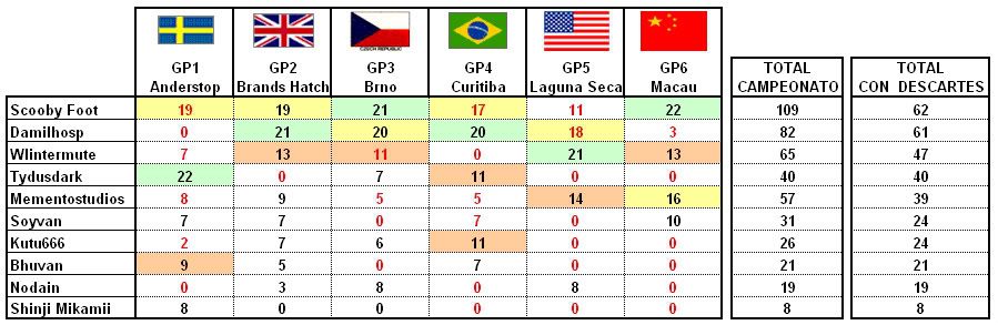 Clasificación general. He descartado los peores resultados de cada uno y he marcado en verde el ganador, en amarillo el segundo y en naranja el tercero de cada carrera.