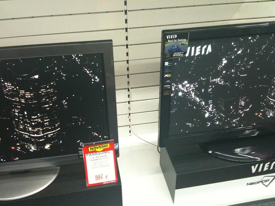 Cuando las he estado viendo por desgracia no pude encuadrar a la Lg y Pana juntas. Pero me sirvió ver los modelos inferiores de las Pana para evidenciar el contraste que tenían el resto. Es decir: la G20 y la PK 950 igualaban visualmente el contraste. Mientras que las gamas inferiores de Panasonic igualaban el contraste con las Pk760, las Pk350 y la Ps8000. Es decir el panorama era bastante desfavorecedor y lo que vi se puede resumir en esta instantanea que tome para hecerme a la idea: